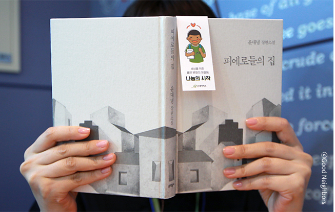 혹시 사진 속 곳곳에 숨어있는 책갈피, 보셨나요? 휴가철 쉬려고 읽는 책인데, 의무감에 더 읽을 필요는 없잖아요. 그럴 때 이 '나눔의 시작' 책갈피가 도와줄 거예요. 언제든지 책갈피를 끼고 책장을 덮어주세요.