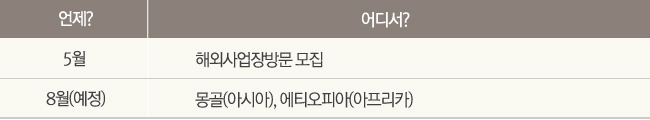 이번에는 멀리 떠나볼까요? 굿네이버스 해외지부를 방문하여 결연아동을 만나고 아동들과 특별한 시간을 가져보세요. 2017년 여름 방학과 여름 휴가는 좋은 이웃과 함께하는 특별한 여행 어떠세요? 특별한 여행이 좋은 이웃을 찾아갑니다. 올해는 몽골과 에티오피아 방문을 할 예정입니다. 두근두근 기대되시나요? 그럼 망설이지 말고 함께 떠나요!! 한 번 해외사업장방문의 매력에 빠져보시면 매년 좋은 이웃 특별한 여행을 떠나게 되실 수도 있으니 주의하세요^^