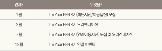 I’m Your PEN은 좋은 이웃 회원님들과 전세계의 결연아동들이 소식을 주고 받을 수 있도록 돕는 번역자원봉사 모임이예요. 좋은 이웃이 아동에게 보내는 소중한 편지와 결연아동이 좋은 이웃 회원님께 보내는 감사 편지를 번역하여 진심을 전달하는 모임에 함께 하시겠어요?