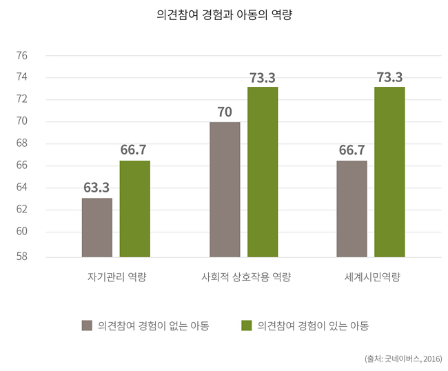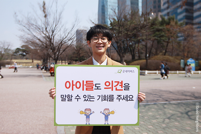 아동에게 참여권은 성인과 마찬가지로 당연히 누려야 할 기본적인 권리이지만, 의견을 낼 수 있는 기회는 많지 않습니다. 실제로 아동의 86.6%가 사회문제나 정치 문제에 대해 의견을 말할 수 있다고 답했지만, 정책제안 등의 활동에 참여한 경험은 3.7%에 그쳐(굿네이버스, 2016) 아동의 참여 기회가 매우 적다는 것을 알 수 있었는데요. 권리 인식과 책임감을 배우며 사회 변화에 참여하는 능동적 시민으로 성장할 수 있도록 돕는 아동의 참여 활동. 아이들이 자유롭게 토론하고 자신의 의견을 제안할 기회가 더 많아졌으면 좋겠습니다.