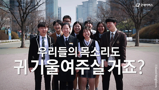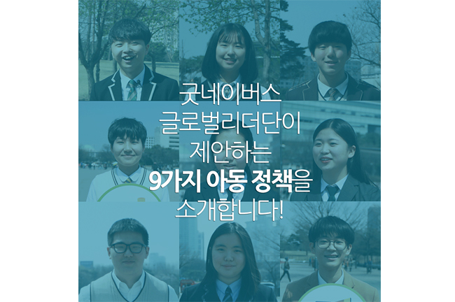 투표권은 없지만 현 상황에 대한 분명한 생각을 갖고있는 우리 아이들! 굿네이버스는 전국의 초·중·고 아이들과의 심층 인터뷰를 통해 아이들의 목소리를 듣고, 여기에 굿네이버스 글로벌리더단 아이들의 의견을 더해 도출한 [9가지 아동 정책]을 제안합니다