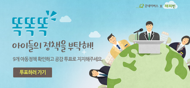 굿네이버스는 4월 19일부터 5월 19일까지 한 달간, 네이버 해피빈을 통해 똑똑똑, 아이들의 정책을 부탁해! 캠페인을 진행합니다.