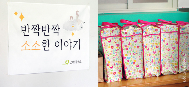 굿네이버스의 여아지원사업은 생리대 같은 여아들에게 꼭 필요한 물품뿐만 아니라 정서적 도움을 줄 수 있는 멘토링까지 함께 지원하고 있습니다. 그리고 또 하나! 오늘은 저소득층 소녀들만을 위한 소소한 시간, 반짝반짝 소소한 이야기를 소개해 드리려고 합니다. 초등학교 고학년 여자아이들이 삼삼오오 모여 굿네이버스 선생님과 함께 이야기 나누며 자신에 대해 알아가는 시간인데요.