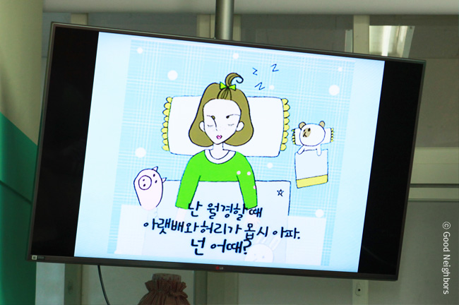 “이건 속옷 교환권인데, 우리 친구들마다 사이즈가 다 다를 거야. 줄자를 이용해서 사이즈를 재 보고, 인터넷으로 신청할 수도 있어. 그리고 생리대, 화장품… 집에 가져가서 자신을 잘 가꾸어보자!”