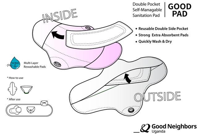 기존의 재사용 면 생리대에서 우간다 현지에 맞게끔 재 디자인하여 '우간다 여아들'만을 위한 생리대를 제작했는데요, 우간다 아이들이 자주 생리대를 교환할 수가 없는 점을 고려하여 기존에 한 번 사용할 수 있었던 면 생리대에 위아래 포켓을 만들어 천을 교환하여 사용할 수 있도록 디자인하였습니다. 천은 흡수력이 좋고 피부 자극이 적은 천으로 제작하여 아이들의 위생과 건강을 고려했습니다. 또, 완성된 3개의 면 생리대 이외에 직접 만들어 볼 수 있는 DIY 한 세트를 넣어 아이들 스스로 생리대를 만들어 써 볼 수 있는 경험을 해볼 수 있게 했습니다.