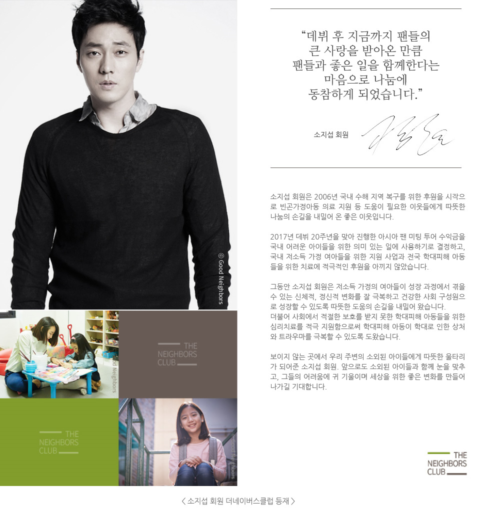 이 기부금은 소지섭 회원의 데뷔 20주년을 맞아 진행한 2017년 아시아 팬 미팅 투어를 성료한 후 그 수익금을 의미 있는 일에 사용하기로 결정한 것인데요, 이 뿐만 아니라 소지섭 회원은 2006년 국내 수해 지역 복구를 위한 후원을 시작으로 빈곤가정아동 의료 지원 등 도움이 필요한 이웃들에게 따뜻한 나눔의 손길을 내밀어 왔답니다.